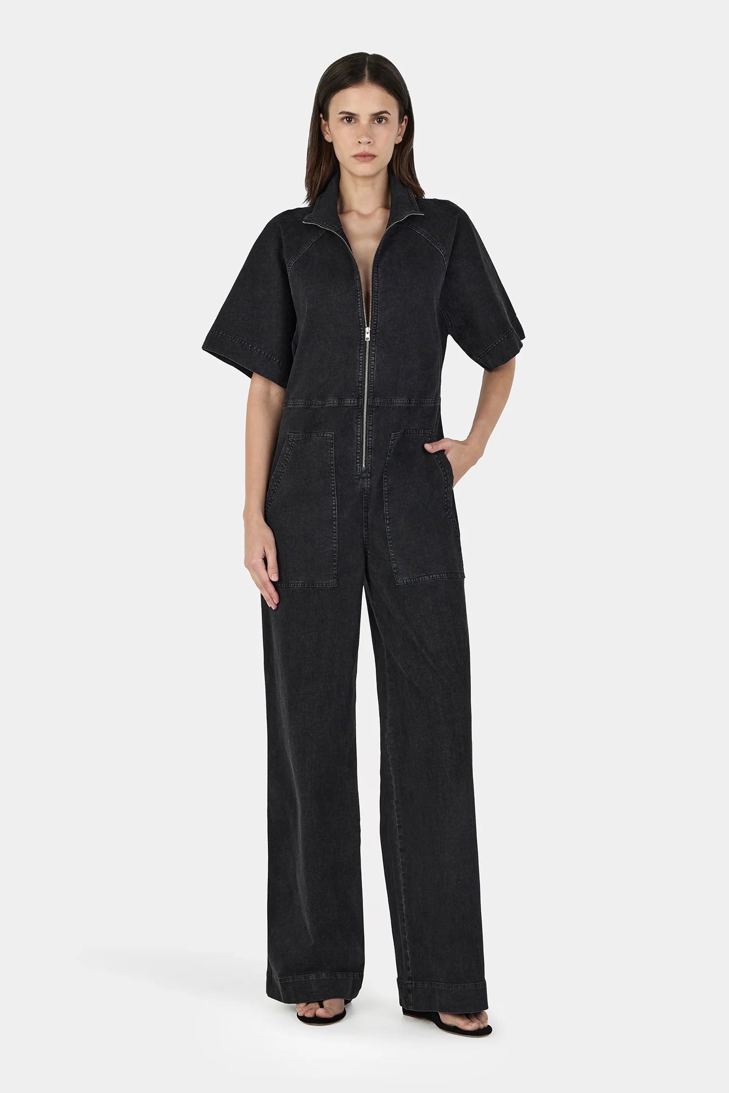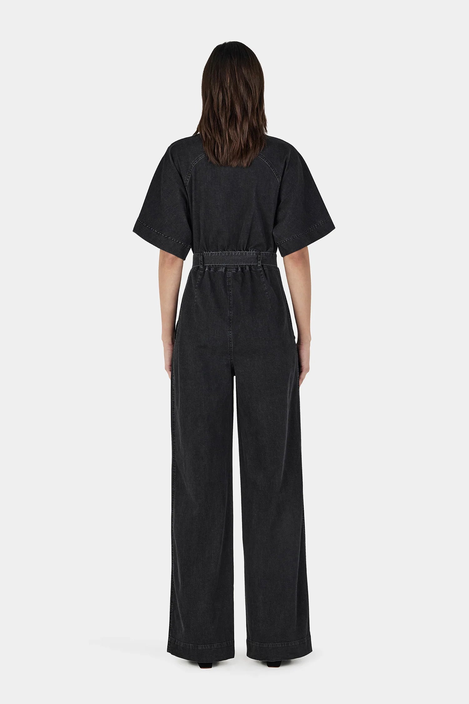The Aria Chambray Jumpsuit is a boiler-style silhouette crafted from lightweight stretch denim. Designed with raglan sleeves, a centre-front zip, and a wide-leg silhouette with an elasticated back waist, the perfect elevated everyday piece.
