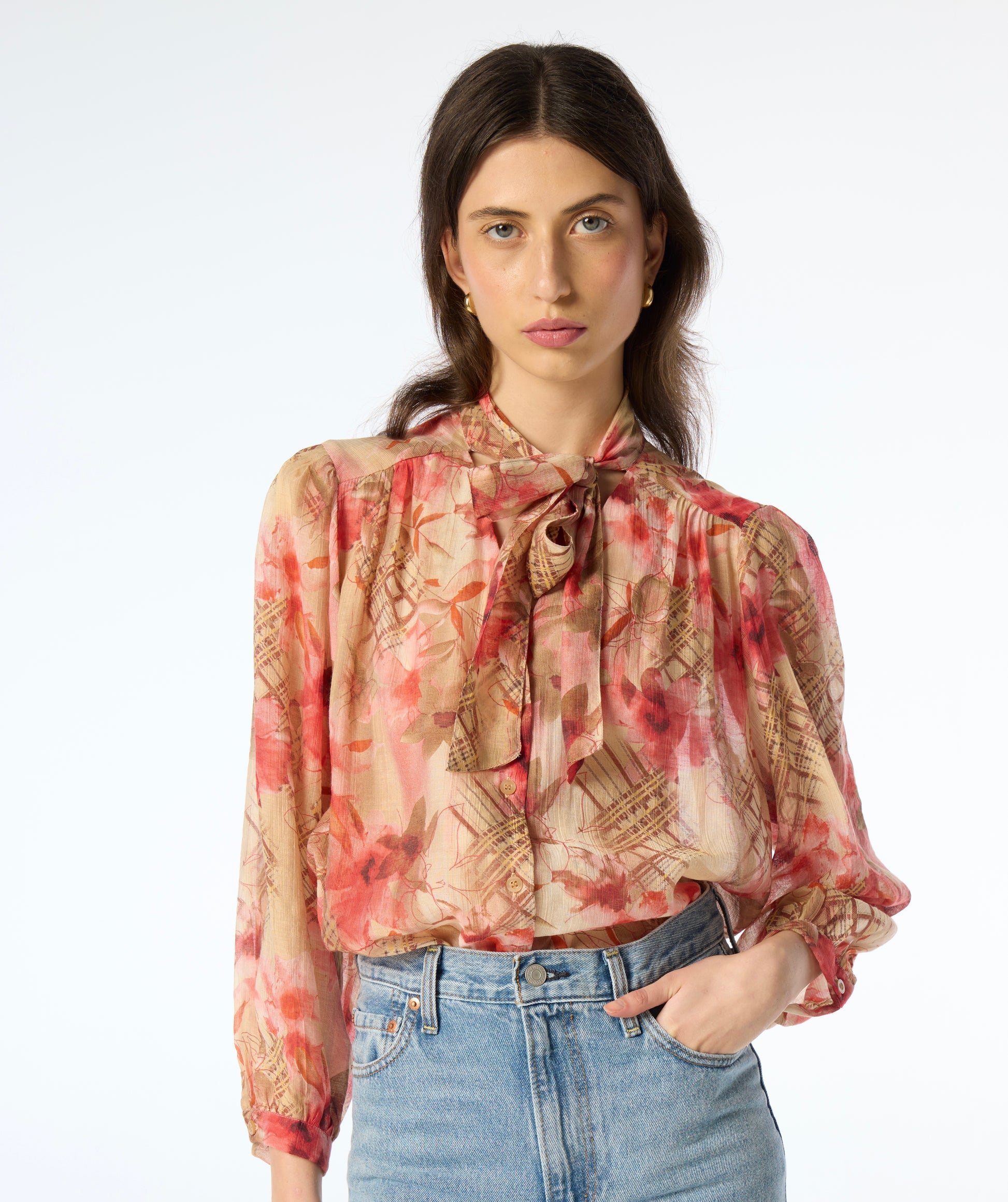 This stunning blouse is both lightweight and elegant with its button-through design and neck tie. It's the perfect addition to your wardrobe!