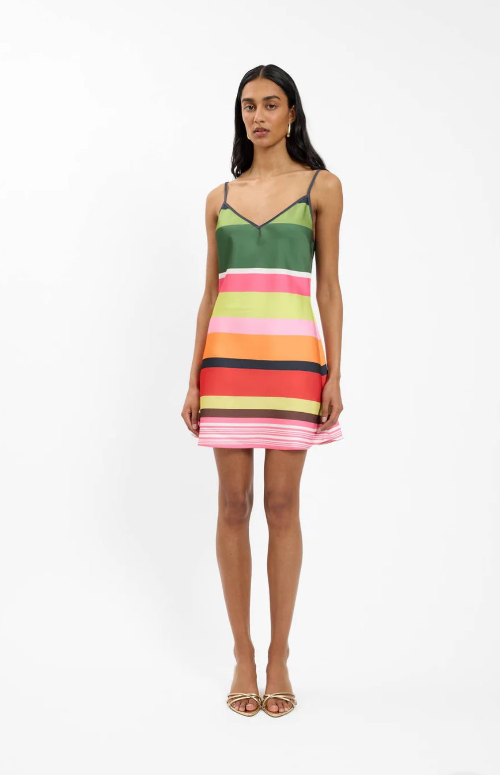 Discover our best-selling silhouette in the exclusive Emerald Stripe print. Cut on the bias for a perfect drape, this A-line design flatters the body effortlessly. Featuring striking colours, it’s the perfect throw-on dress for any occasion.