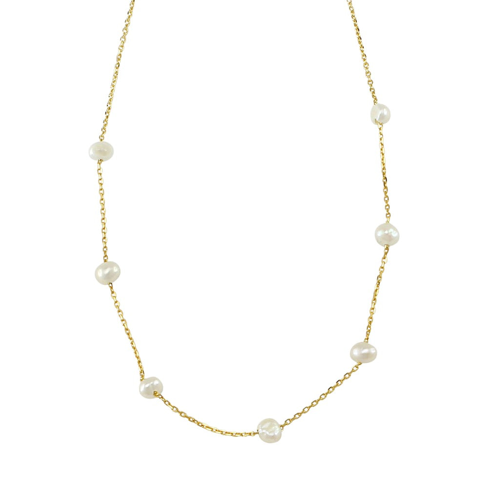 This delicate necklace features 7 fresh water pearls on a fine gold chain. total lenght 42cm.