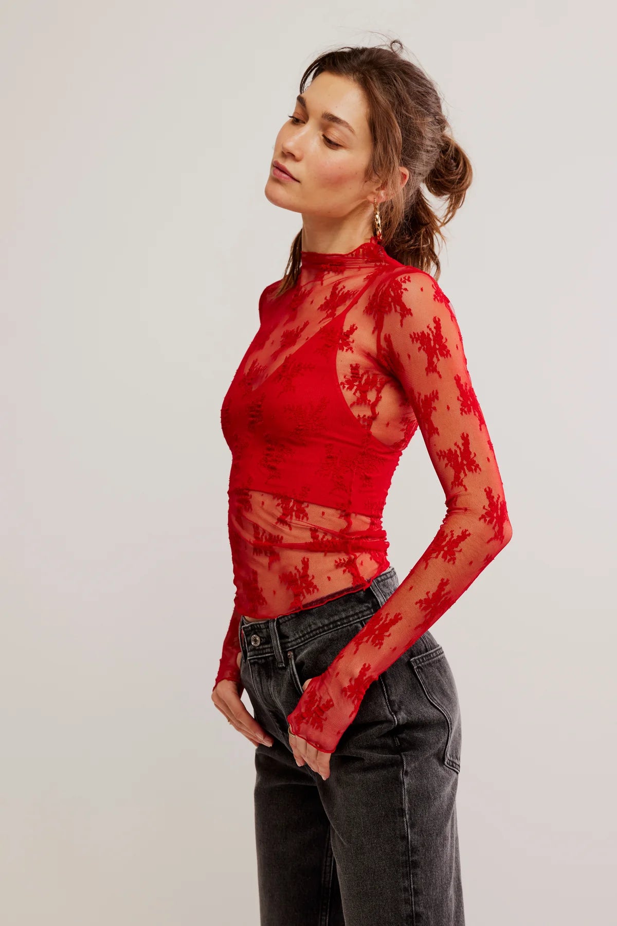 Perfect for layering, this sultry mesh long-sleeve is featured in a sheer design with floral embroidery, a high-neckline and thumbhole details.