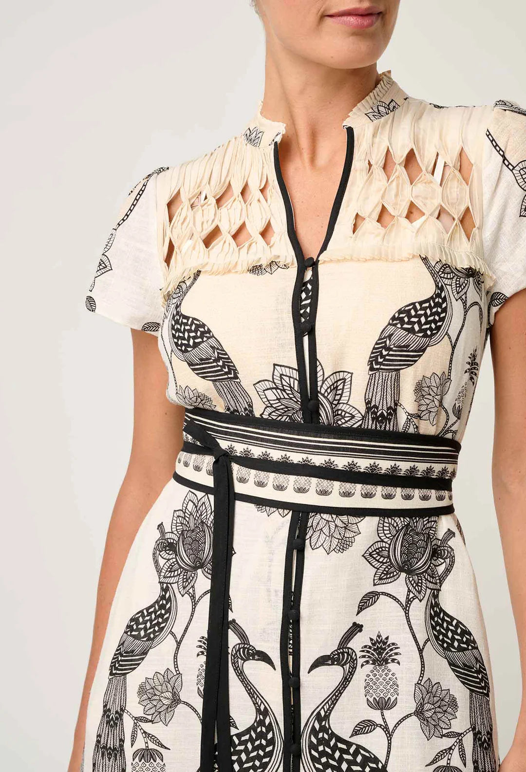 The intricately printed florals and regal birds cascade effortlessly down the A-line silhouette, drawing the eye and adding artisanal flair. Thoughtfully designed with a V-neckline, soft cap sleeves, and a contrasting waistband tie, the Xanthia dress flatters the figure while remaining comfortable and breathable.